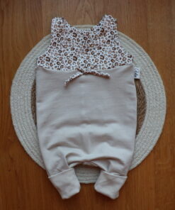 Der Babystrampler hat extralange Mitwachsbündchen, die toll mitwachsen und dafür sorgen, dass der Strampler lange getragen werden kann. Er ist am Po weit geschnitten und bietet auch bei einer Stoffwindel gut Platz. Oben ist er mit zwei Druckknöpfen geschlossen und mit einer Kordel verziert.