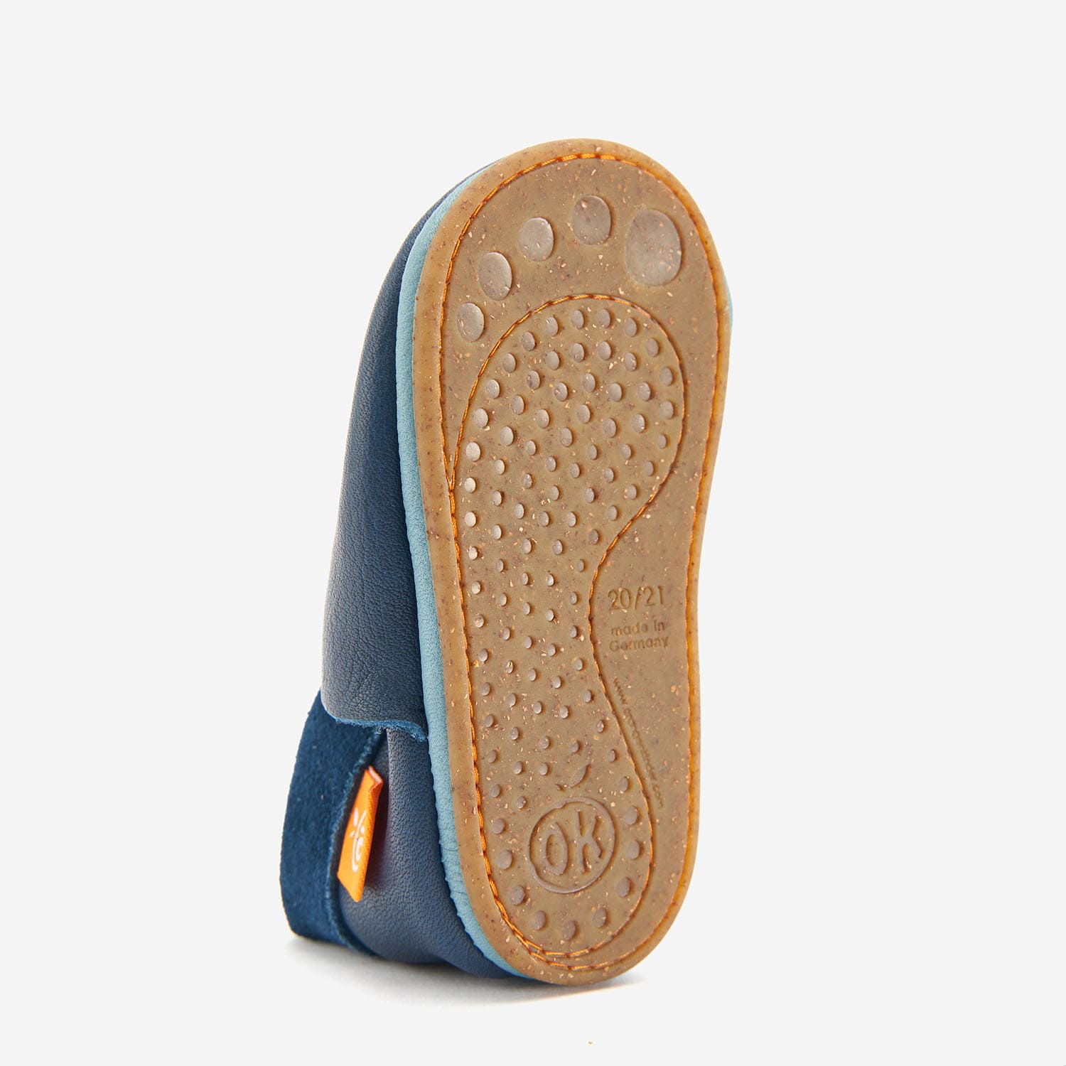 Die Orangenkinder „AMIGOS“ sind aus atmungsaktivem und pflanzlich gegerbtem Bio-Nappaleder händisch gefertigt. Durch die rutschfeste, flexible Sohle aus Gummi und Kork sind sie perfekt geeignet für kleine Laufstarter im Innen- und trockenen Außenbereich. Besonders ist: Unsere Amigo Sohle ist nicht geklebt- nur genäht! Dadurch verzichten wir auf potentiell giftigen Kleber und schützen die Umwelt.