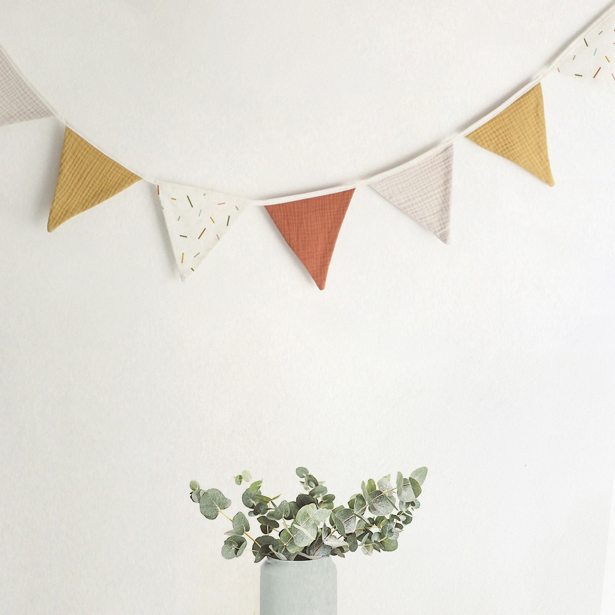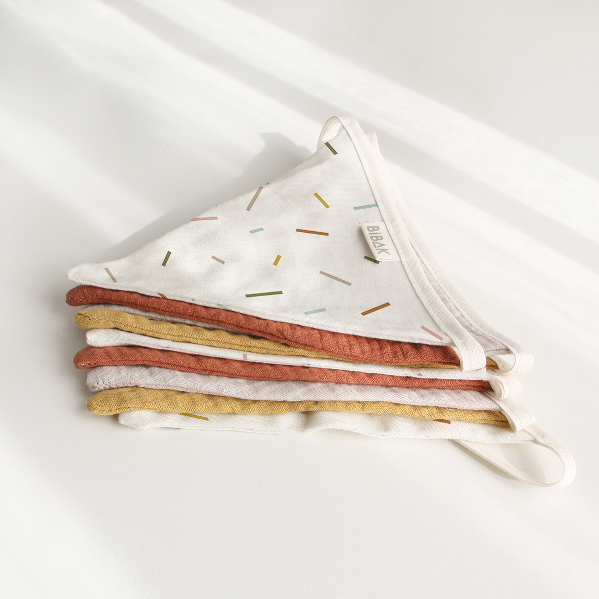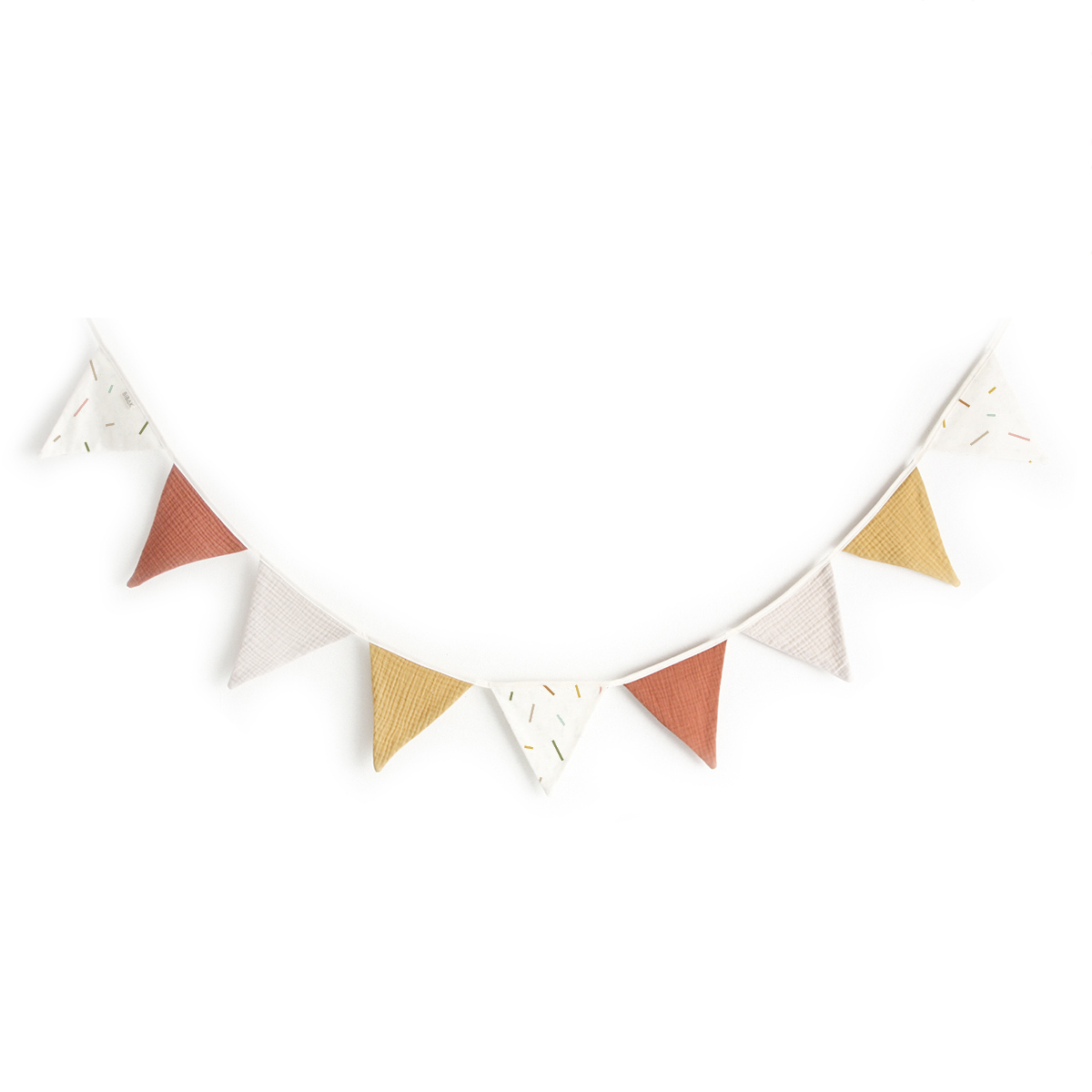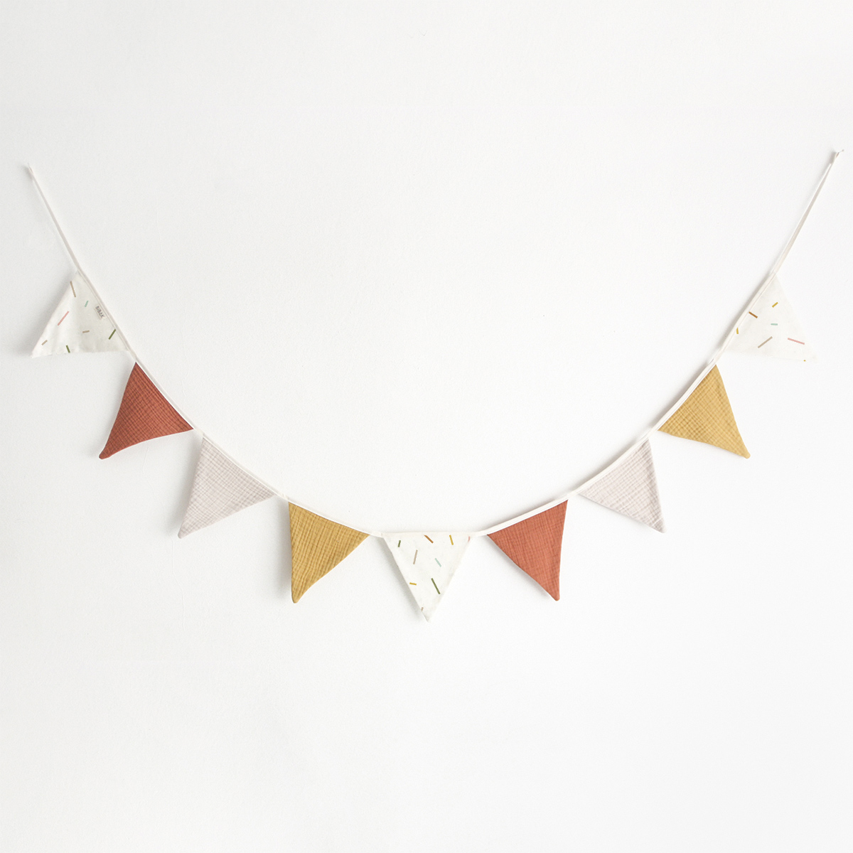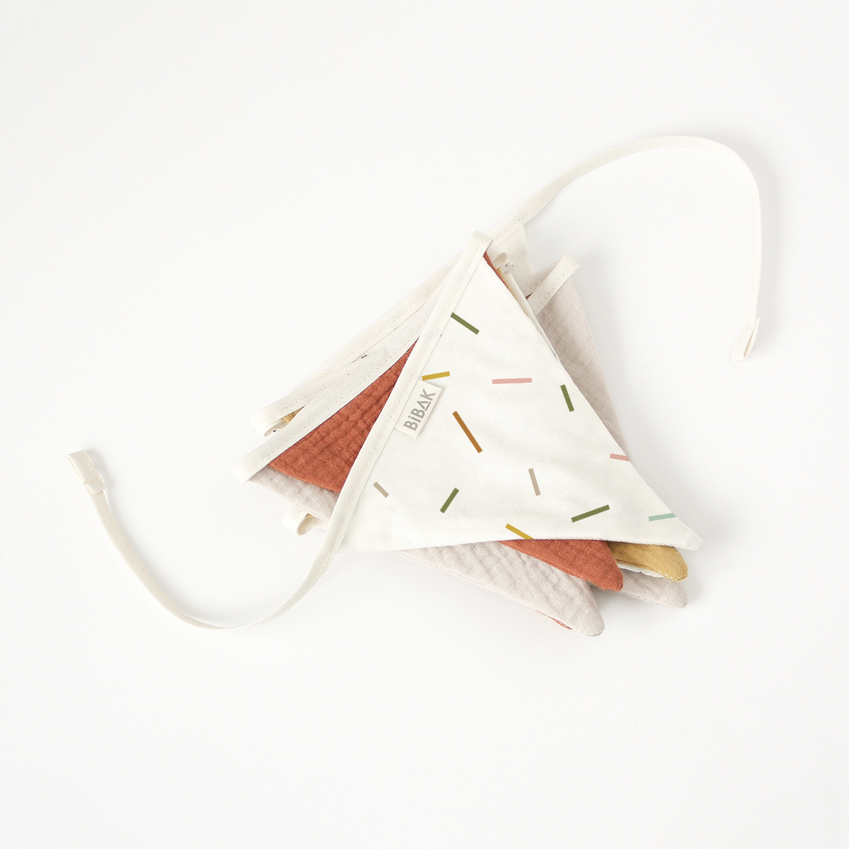 Verleihe dem Kinderzimmer oder deinem Zuhause mit der BIBAK Wimpelkette aus Stoff (Restenverwertung) | Sticks EARTH eine besondere Note. Diese Girlande besteht aus Stoffwimpeln und bringt mit ihrem natürlichen Design eine warme und einladende Atmosphäre in jeden Raum. Die Wimpel werden aus den Reststoffen der Produktion der Bibak Kollektion hergestellt.