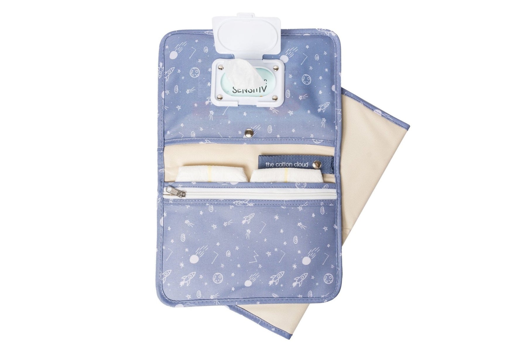 Die Cotton Cloud Windeltasche & Wickelunterlage | Galaxy mit dem ikonischen Muster ist unverzichtbar, um für jede Wickelsituation gerüstet zu sein. Diese Wickeltasche besteht aus einer großen Wickelunterlage, einem Feuchttuchbehälter und einer großen Reißverschlusstasche, in der du alle wichtigen Wickelutensilien problemlos verstauen kannst (3- 4 Windeln, Cremes…)