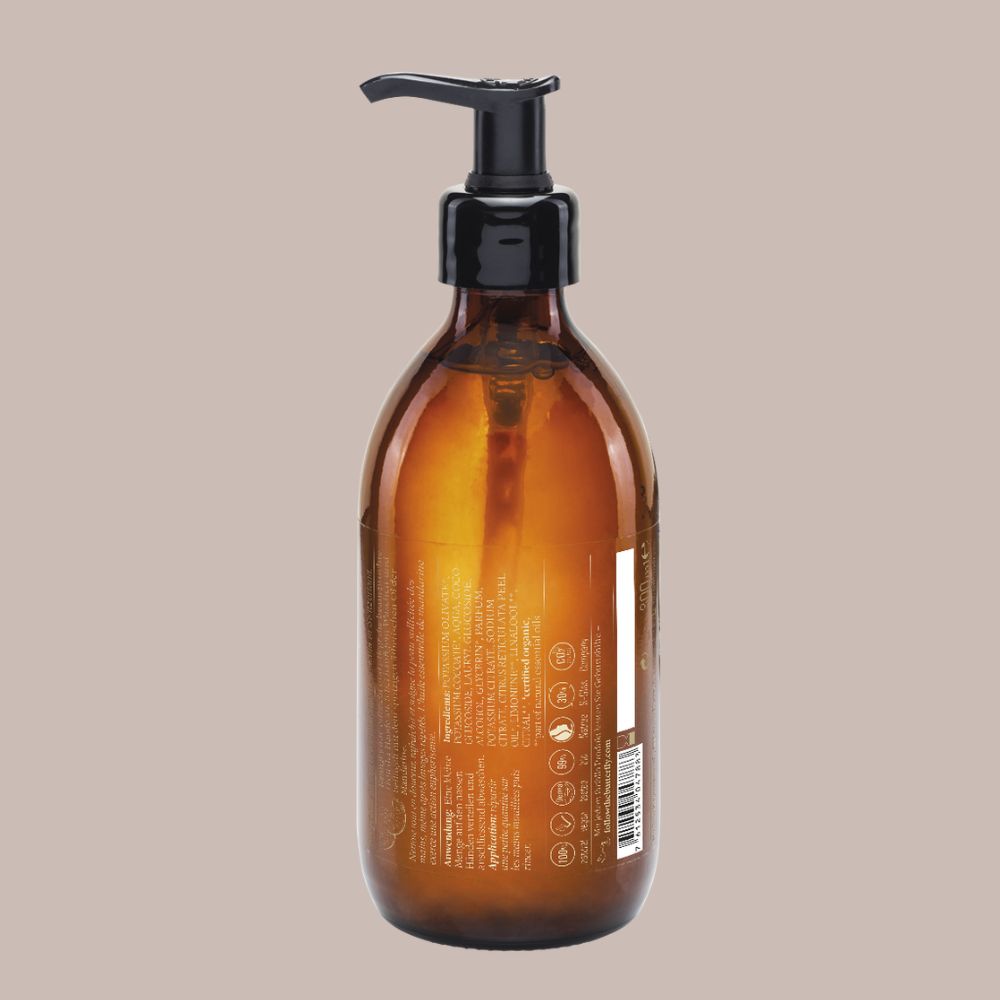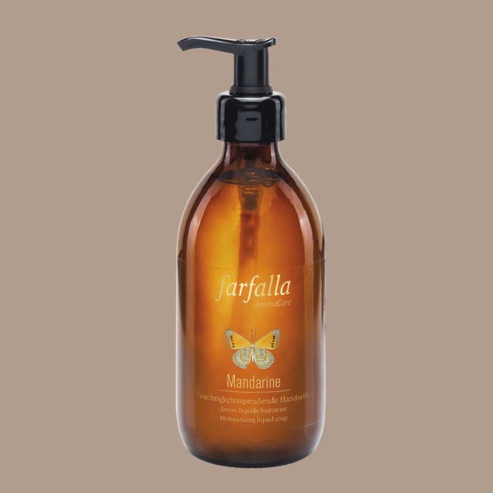 Erfrische und pflege deine Hände mit der farfalla Feuchtigkeitsspendende Handseife (250ml) | Mandarine . Selbst bei häufigem Waschen reinigt sie sanft, ohne die Haut auszutrocknen, und verwöhnt mit dem belebenden Duft ätherischen Mandarinenöls.
