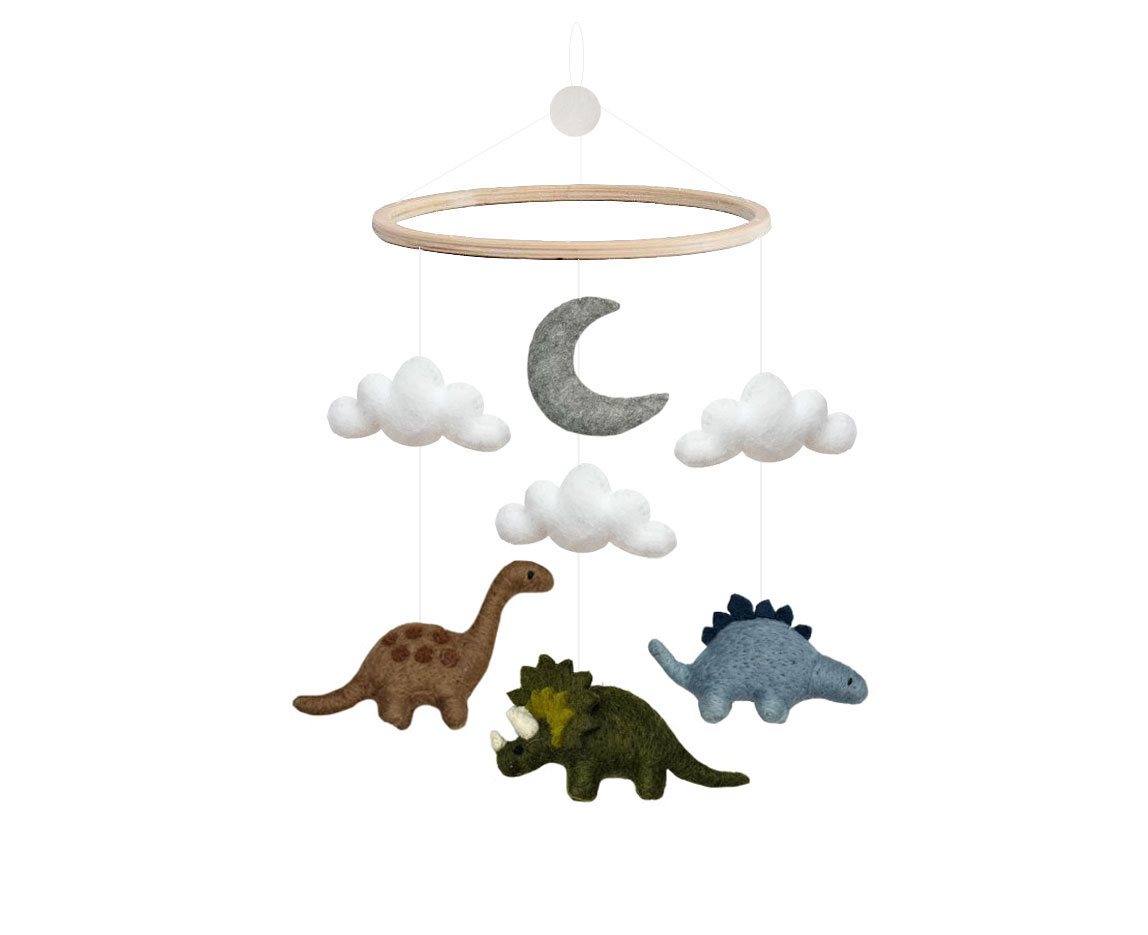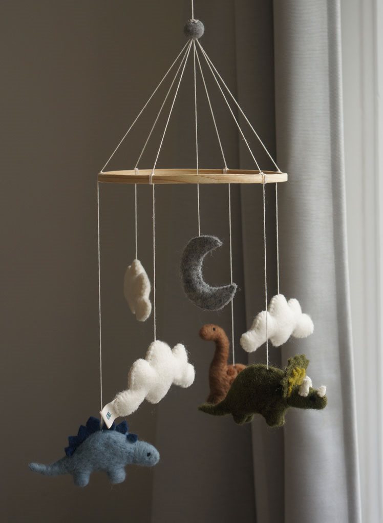 Wunderschönes und detailliertes Mobile aus Filz mit Gamcha Baby Mobile aus Filz | Dino blau grün braun wird in Nepal von Frauen hergestellt unter fairen Arbeitsbedingungen und fairer Entlöhnung. Ein wunderschönes und perfektes Geschenk zur Geburt, für eine Babyparty, einen Geburtstag oder als Mutterschaftsgeschenk.