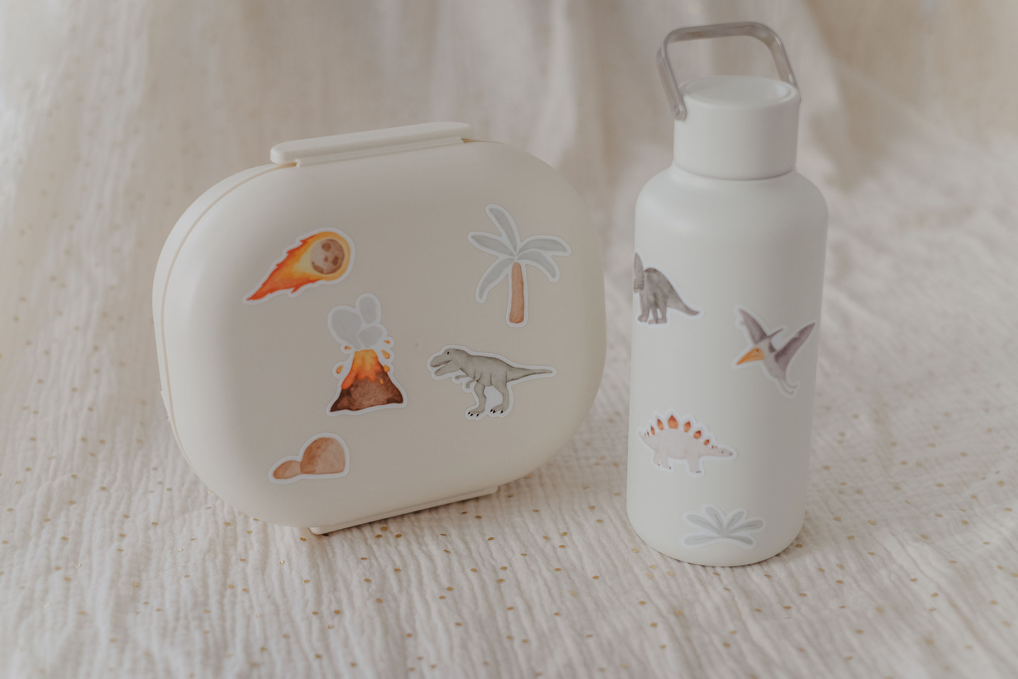 Die coolen Hej Hanni Sticker (spülmaschinenfest) | Dino lassen sich für Lunchboxen, Trinkflaschen, Taschen und viele weitere Sachen mit glatten Oberflächen nutzen. So kann dein Kind seine Kreativität ausleben und seine Gegenstände gut kennzeichnen und individualisieren. Die süssen Illustrationen sind ein toller Hingucker auf diversen Sachen.