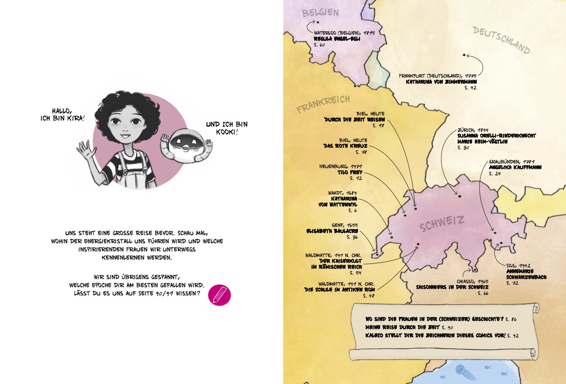 Reise mit Kira durch die Zeit und begegne Frauen, die Schweizer Geschichte schrieben! Kiras Mutter ist eine geniale Erfinderin. Doch als sie ihre selbstgebaute Zeitmaschine benutzt, verschwindet sie plötzlich. Ist sie auf ihrer Suche nach dem geheimnisvollen Energiekristall zu tief in die Vergangenheit gereist? Kira verfolgt ihre Spur, begleitet von Kooki, dem intelligenten Zeitreise-Roboter. Auf ihrer turbulenten Reise durch die Zeit begegnen sie faszinierenden Schweizerinnen. Ob als Soldatin, Ärztin, Politikerin, Malerin, Aktivistin, Unternehmerin, Gastarbeiterin oder Spionin: Diese Frauen haben Geschichte geschrieben!