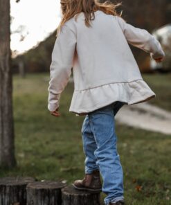 Mit seinem grosszügigen Schnitt wächst der Pullover mit deinem Kind mit und wird zum langlebigen Begleiter. Die Armbündchen sind extra lang, dass man sie auch hochschlagen kann.