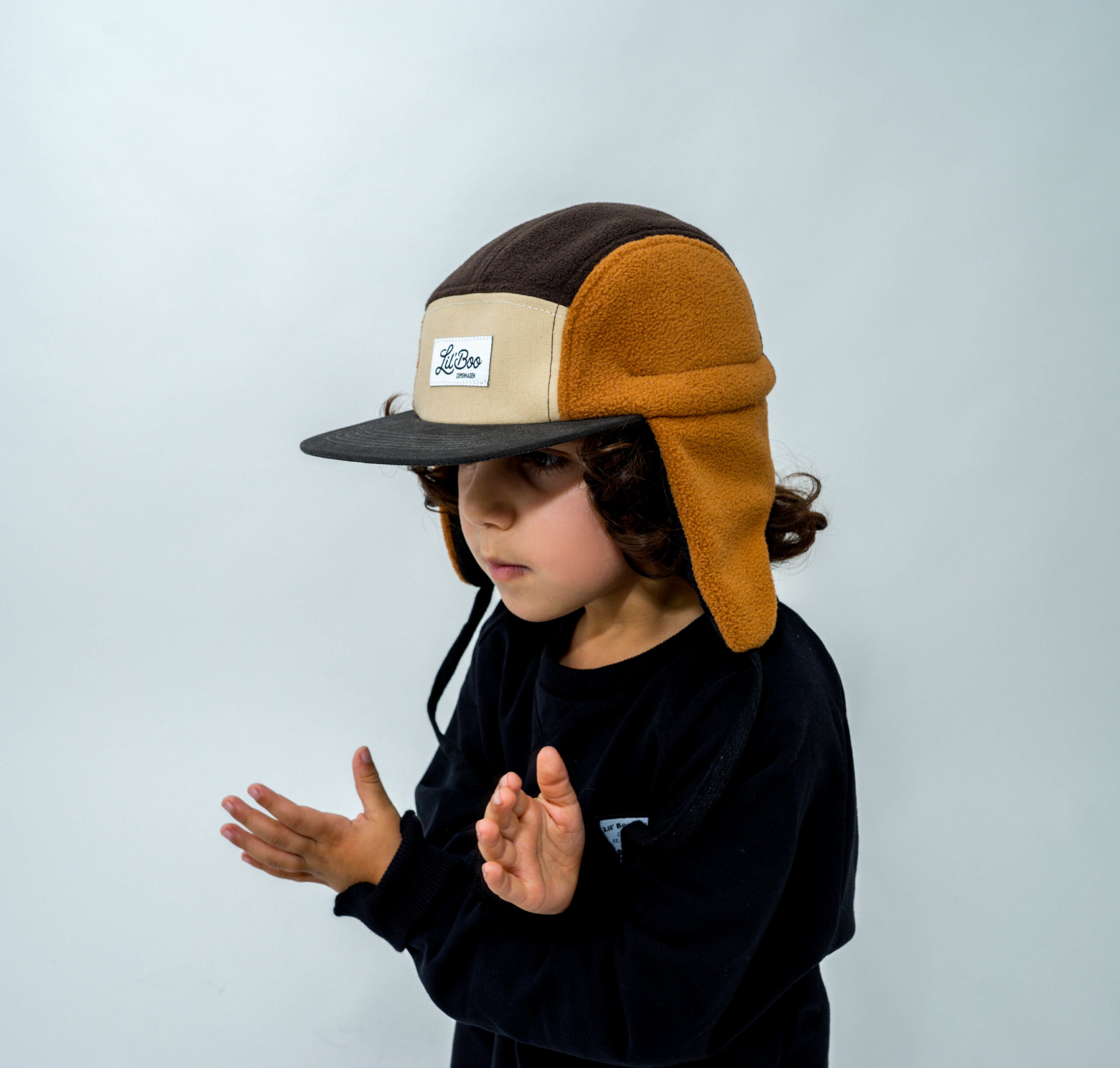 Die LIL‘ BOO 5 Panel Fleece CAP mit Fleece und Ohrenklappen | brown ist eine coole 5-Panel Cap mit Ohren ist der perfekte Begleiter für kühle Tage! Aus Fleece, Canvas und einem warmen Thermo-Futter gefertigt, hält sie kleine Köpfe angenehm warm – und sieht dabei noch richtig stylisch aus.