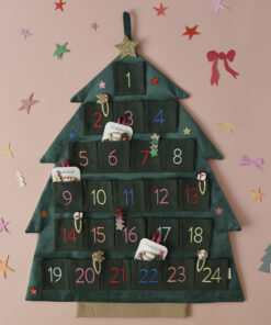 Dieser wunderschöne Rockahula Adventskalender (wiederverwendbar) | Christmas Tree Starry in Form eines Weihnachtsbaums macht die Vorweihnachtszeit noch zauberhafter! Aus weichem Samt gefertigt, mit einer goldenen Sternspitze und bunten Glitzersternen geschmückt, bietet er 24 grosszügige Taschen für kleine Überraschungen – ideal für Süsses, Haarspangen oder andere Rockahula-Schätze.