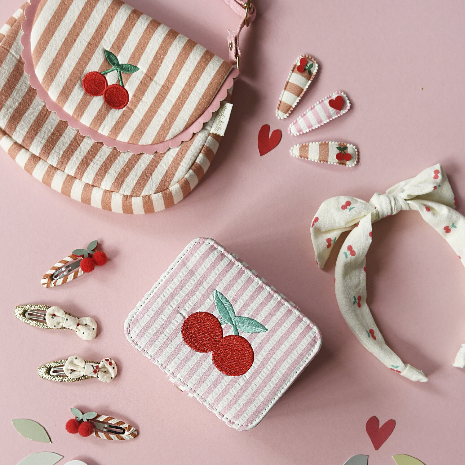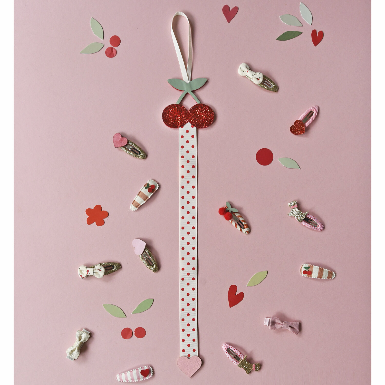 Rockahula Haarspangen | stripy cherry – süsse Haarspangen von Rockahula. Hergestellt aus recyceltem Filz, Glitzer, Bändern und PU.
