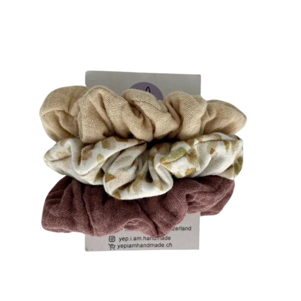 Wunderschöne Scrunchie Set Kinder | beige-mauve-pünktli von YEPIAMHANDMADE für Kinder (oder Erwachsene). Aus schlichten, geschmackvollen Musselin-Stoffen, liebevoll von Hand im Atelier in Aarau gefertigt.