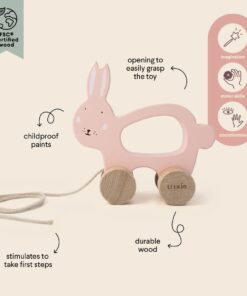 Dein kleiner Entdecker oder deine kleine Entdeckerin wird diesen liebevollen Hasenfreund über jeden Schritt begleiten – dank Kordel und ergonomischem Griffloch leicht zu ziehen oder zu schieben. Aus FSC®-zertifiziertem Holz, farblich sicher, ungiftig und langlebig.